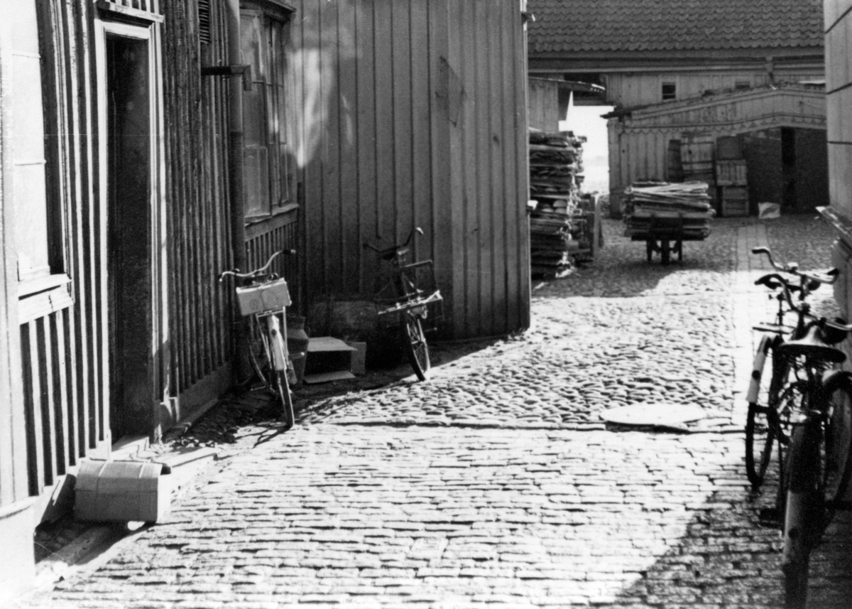 En bakgård i Jönköping belagd med kullersten. Cyklar står lutade mot husväggen, en handkärra med ved och en vedstapel syns i bakgrunden.