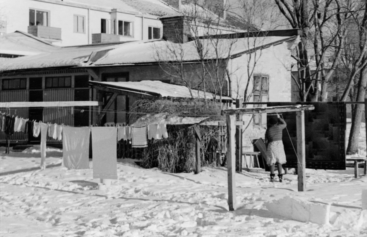 En vintrig bakgård i Jönköping med tvätt på tork. En kvinna piskar en matta vid piskställningen.