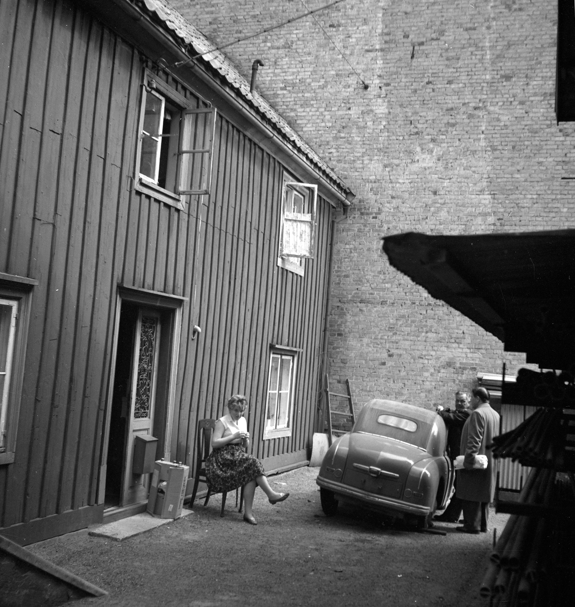 En bakgård vid Smålandsgatan i Jönköping. På stolen sitter Inga-Britt Friman, innehavarinna av Ajax hattaffär. Vid bilen står bilförsäljare Oscar Jonsson och Jönköpingsprofilen Häggman med ett paket under armen. Till höger syns delar av Elander & Lundbergs järnlager.
