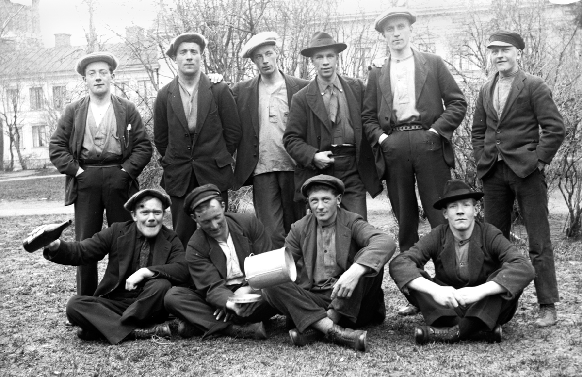 Några män står eller sitter på en gräsmatta, i bakgrunden syns bostadshus. En man håller i en glasflaska och en annan i en metallburk med lock.