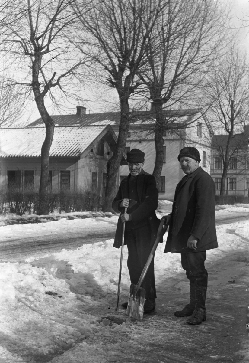 Två män hackar bort is från en väg med spett och spade i ett bostadsområde.
