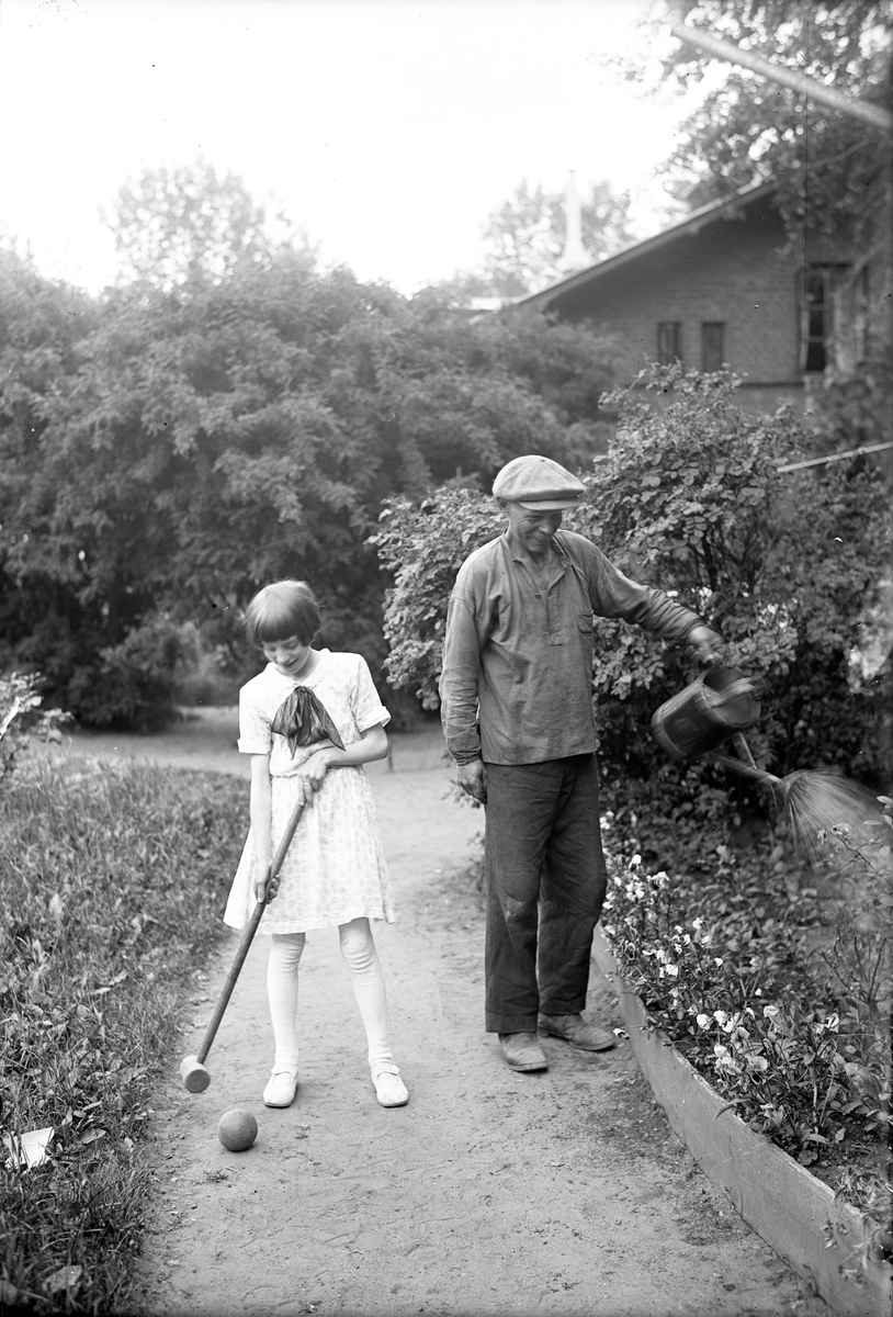 En man vattnar blommorna i rabatten och en flicka spelar krocket på grusgången vid tändsticksbolagets arbetarbostäder i kvarteren Jägmästaren/Järnbäraren i Jönköping.