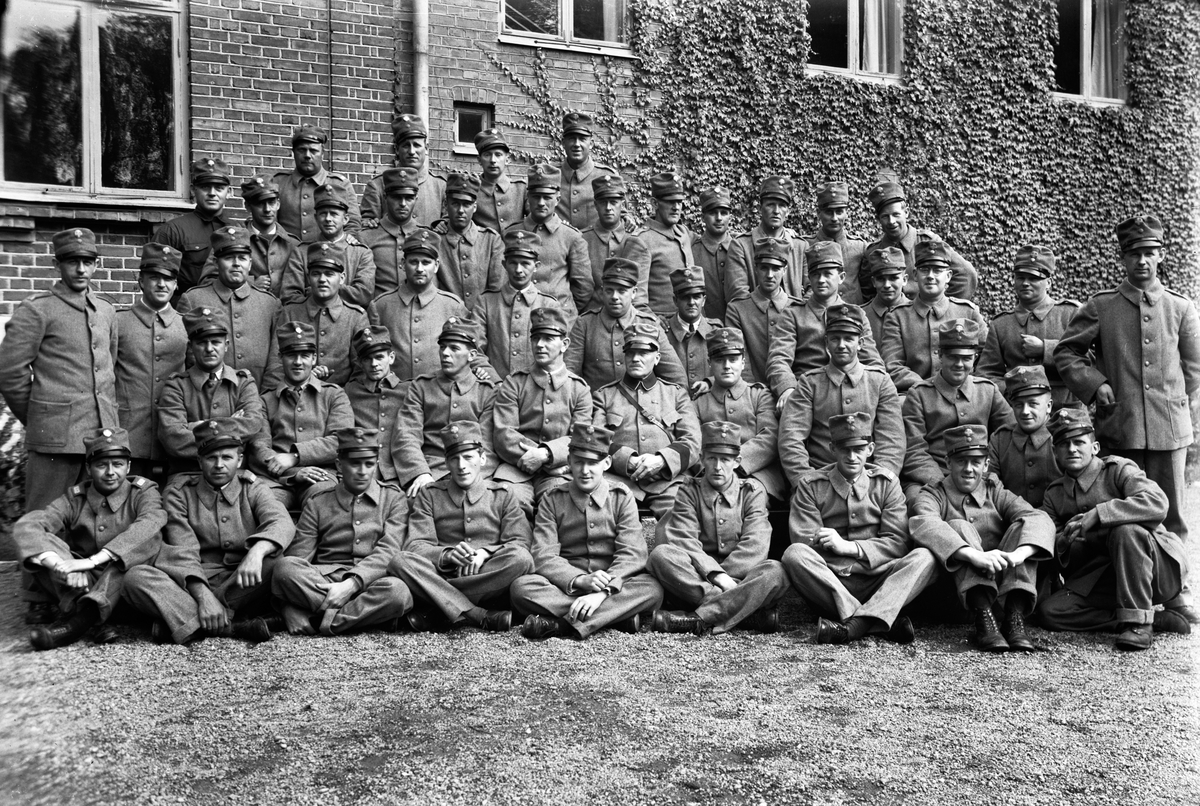 Militärer i uniform är uppställda framför ett tegelhus, med murgröna klättrande på väggen, vid militärförläggningen A6 i Jönköping.
