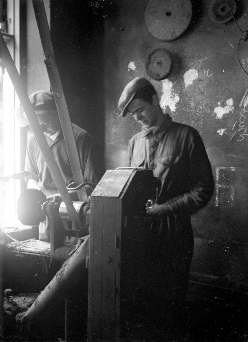 Titel: Två män på en arbetsplats i Jönköping, vid en maskin, kanske en svarv.