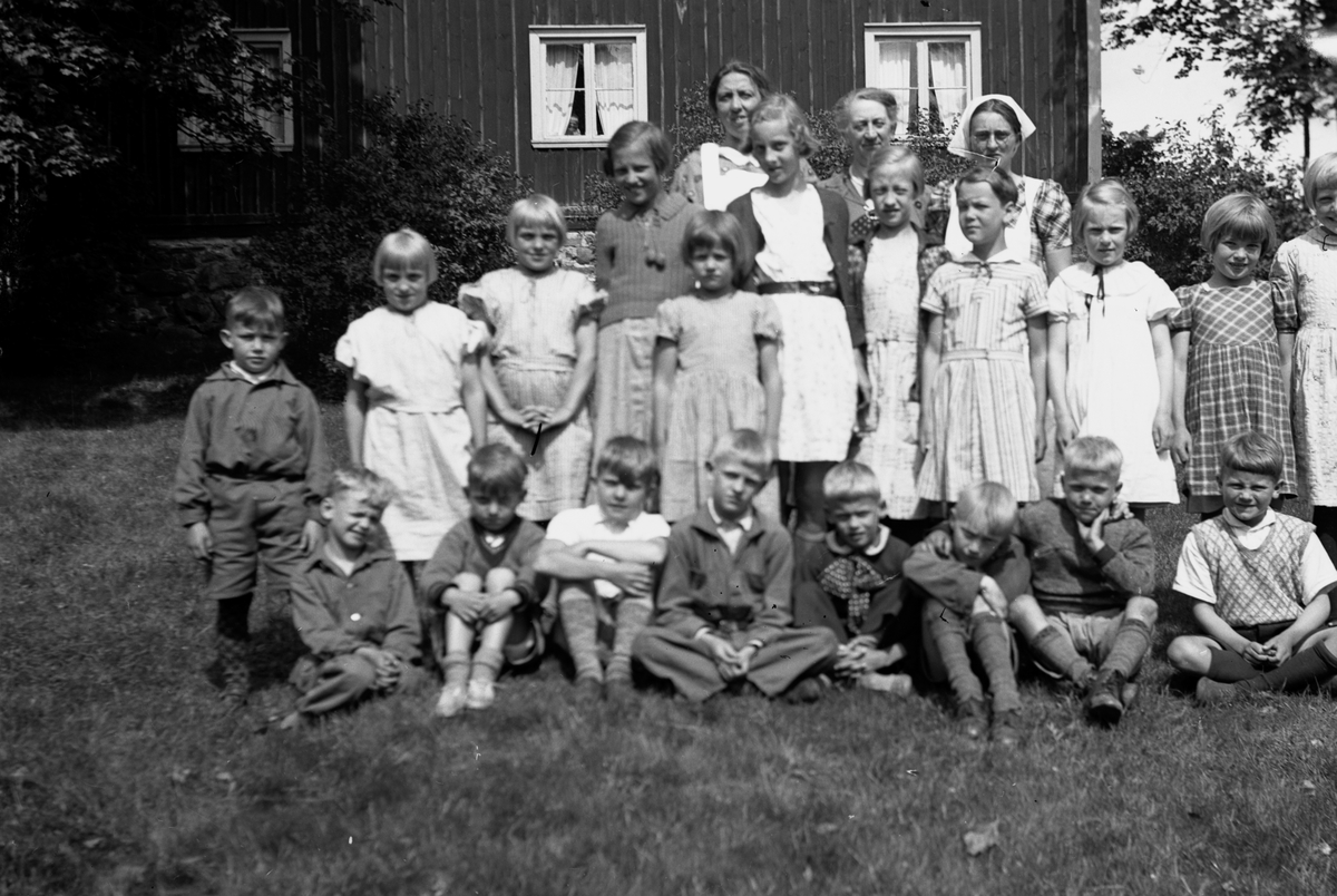 Barnkoloni på Röksberg vid Mulseryd utanför Jönköping. Översta raden: Ebba (1) lärarinna och Annie Svensson (3) senare föreståndare på ålderdomshemmet. I andra raden står Birgit Neij (2) och Inga Neij (3), de var två i en syskonskara på 13 barn.