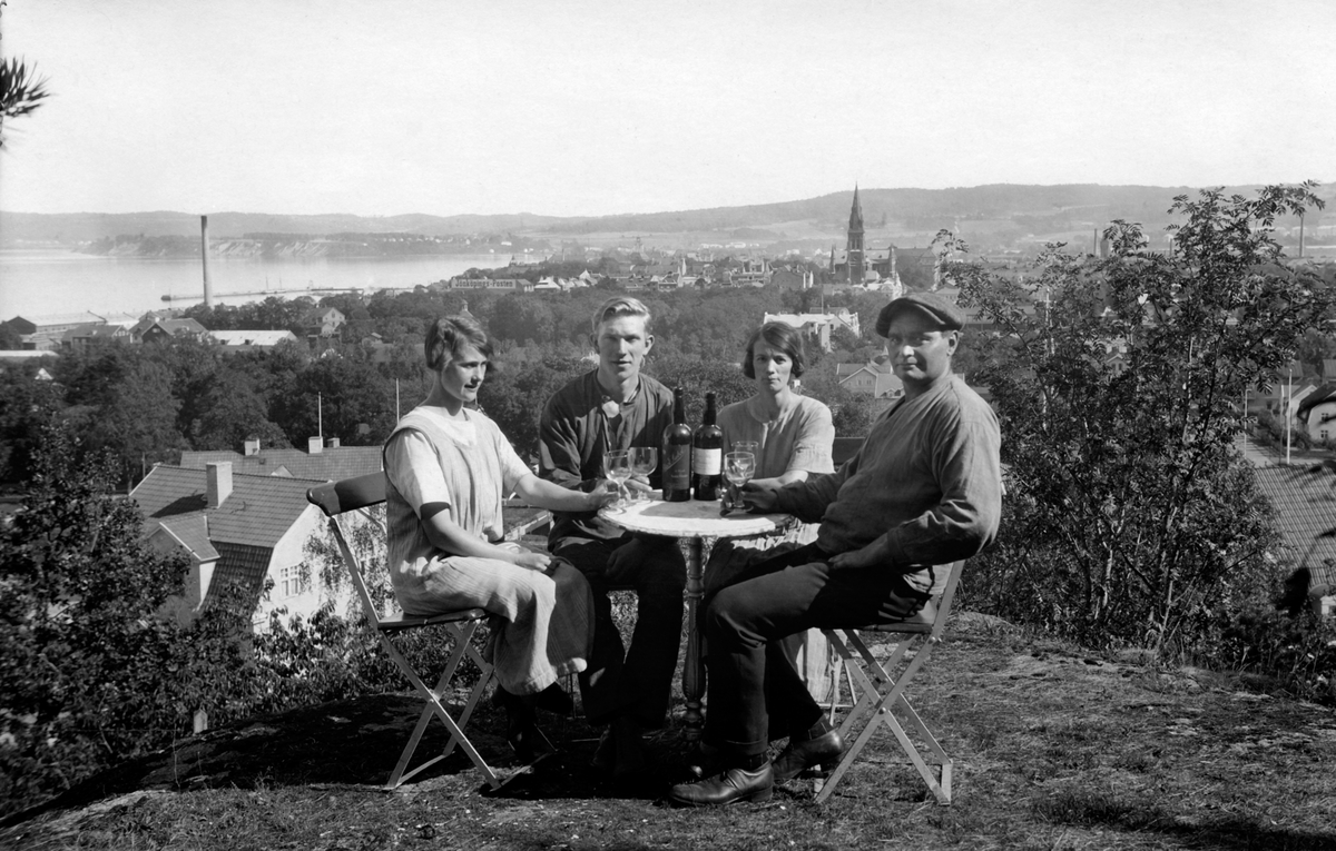 Två kvinnor och två män sitter vid ett bord med vinflaskor och glas utanför Alphyddan i Jönköpings Stadspark. I bakgrunden syns Jönköping stad och en del av Vättern.