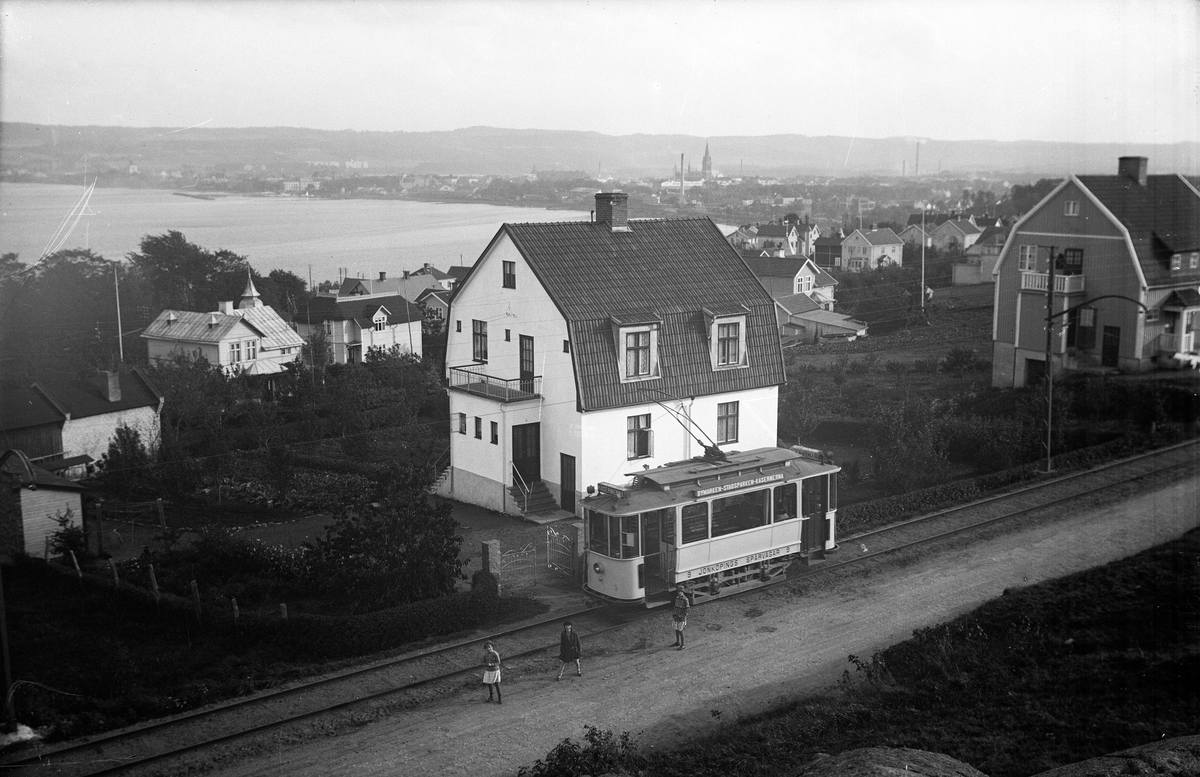 Spårvagn som går mellan "Bymarken - Stadsparken - Kasernerna". På vagnen står även texten "9 Jönköpings spårvägar 9". Här har den gjort ett stopp på Bymarken. Tre flickor står på vägen som går längs med spåret.