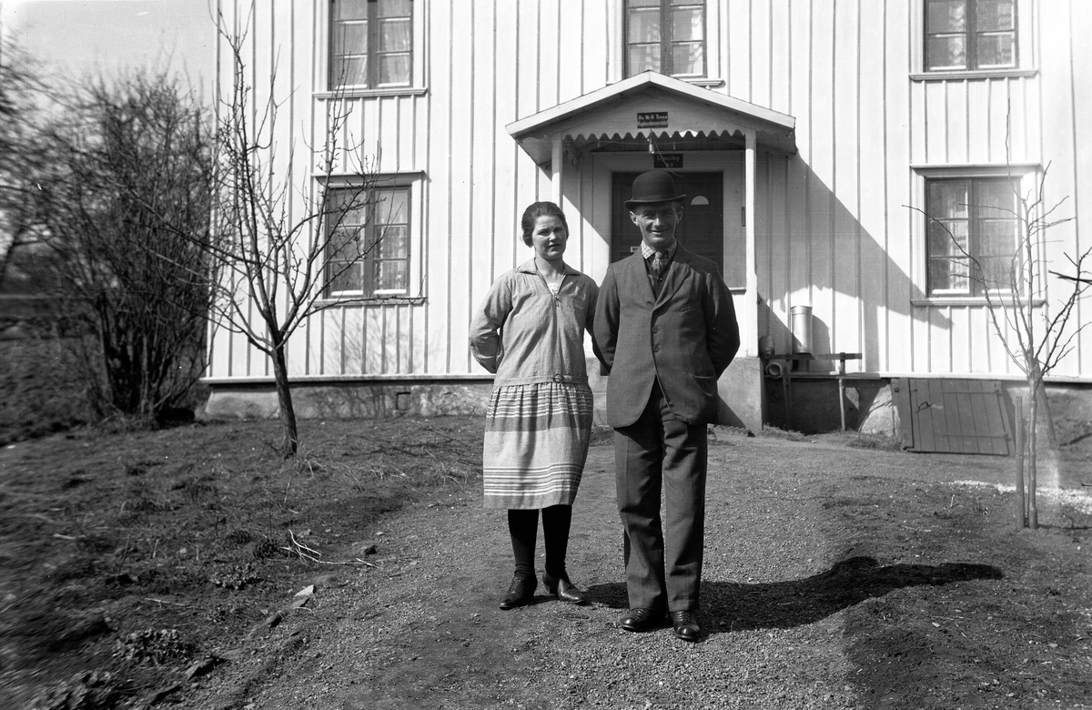 Ett par står i trädgården framför huset med adress "Kv. Nr 11 Trosa Kaptensboområdet, Liljenstorp Nr 9" i Jönköping.