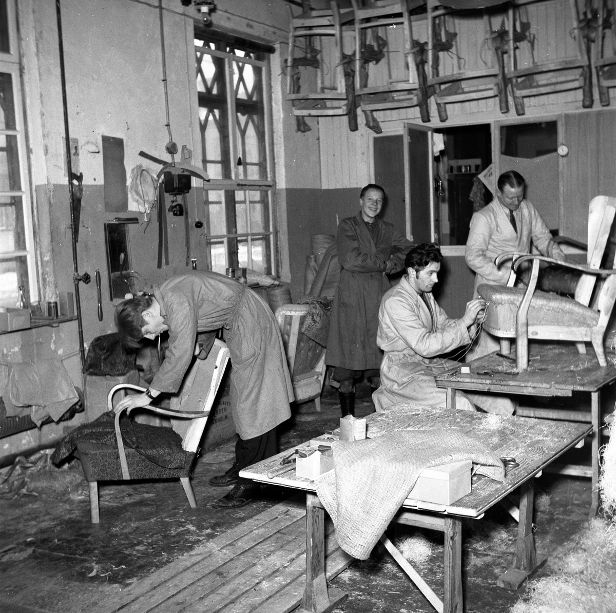 Arbetare i Eines tapetserarverkstad på Östra Storgatan 109 i Jönköping, i samma byggnad som Janssons skofabrik. Från vänster: Stig Palm, Douglas Johannesson, Lennart Engström och innehavaren Einar Nilsson.