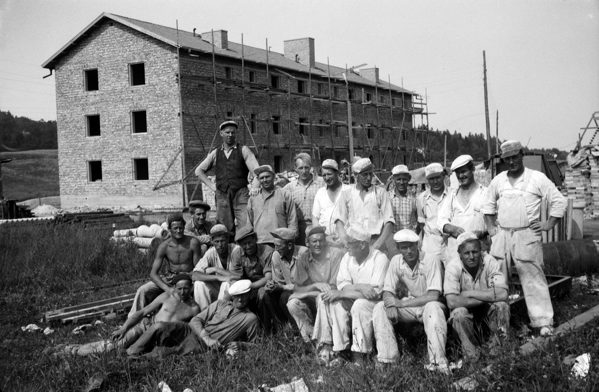 Byggnadsarbetare framför ett bostadshus i tegel under uppbyggnad i Jönköping. Sittande nr 2 från vänster är Kalle "Timpa" Simonsson, murare och känd fotbollsspelare från J-södra.