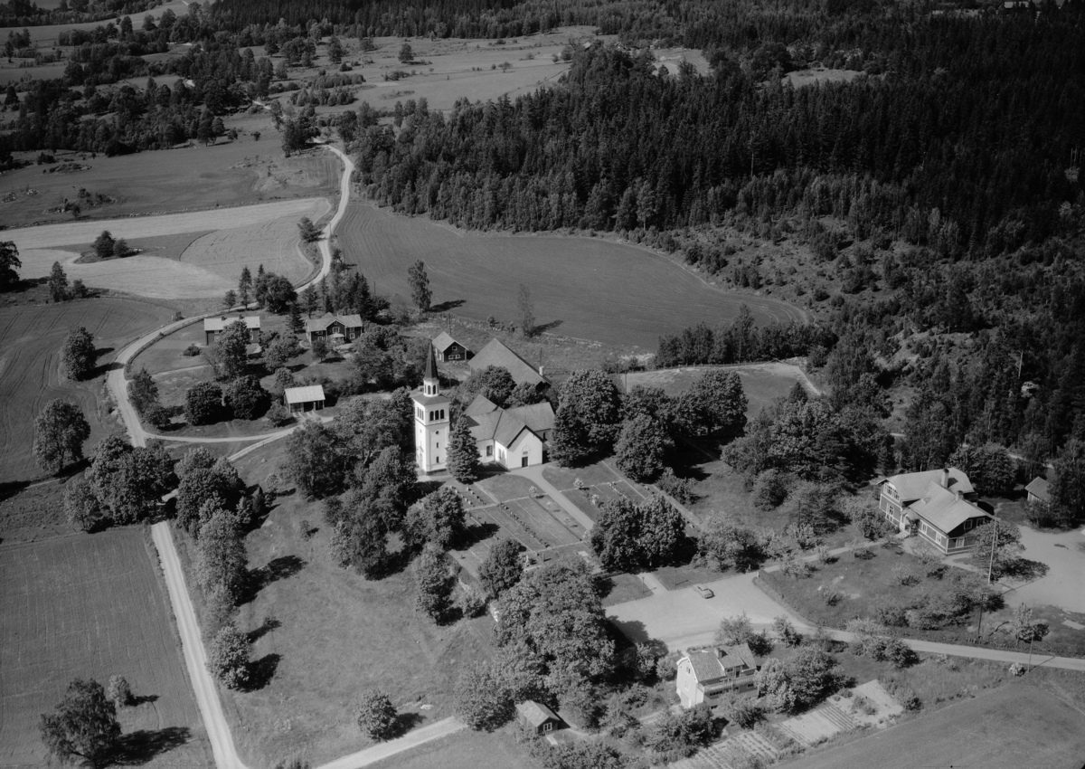Flygfoto över Marbäck och Marbäcks kyrka i Aneby kommun, Jönköpings län. 796/1964