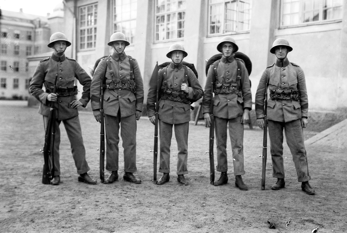 Fem soldater med gevär och packning utanför Jönköpings Regemente I12.