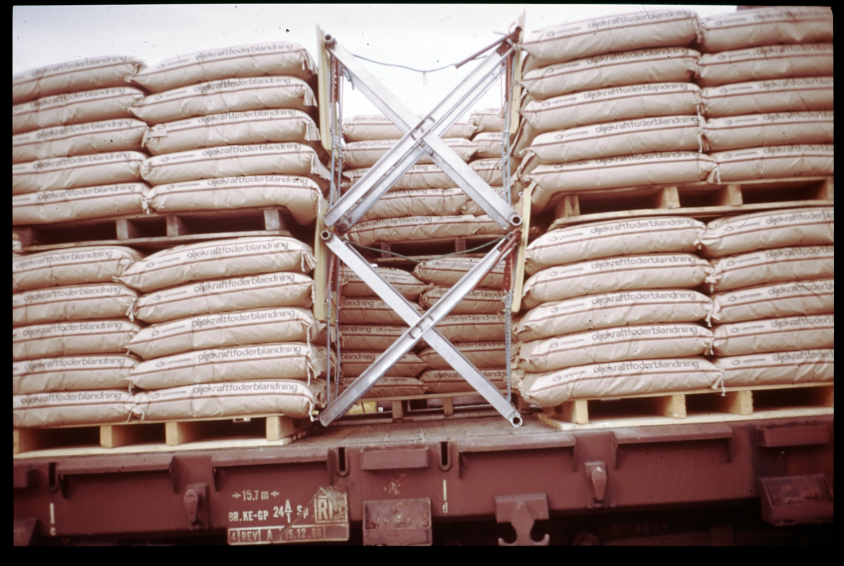 Säckar med oljekraftfoderblandning, lastade på flatvagn.
