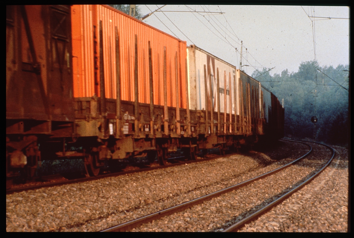Godsvagnar lastade med containrar.