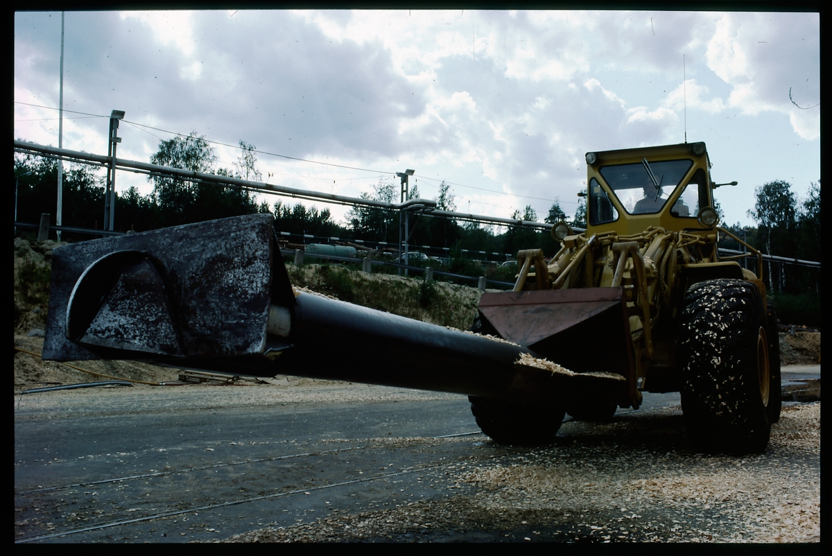 Hjullastare med träflis.