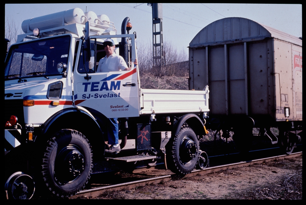 SJ-Svelast rälsbil vid godsvagn.