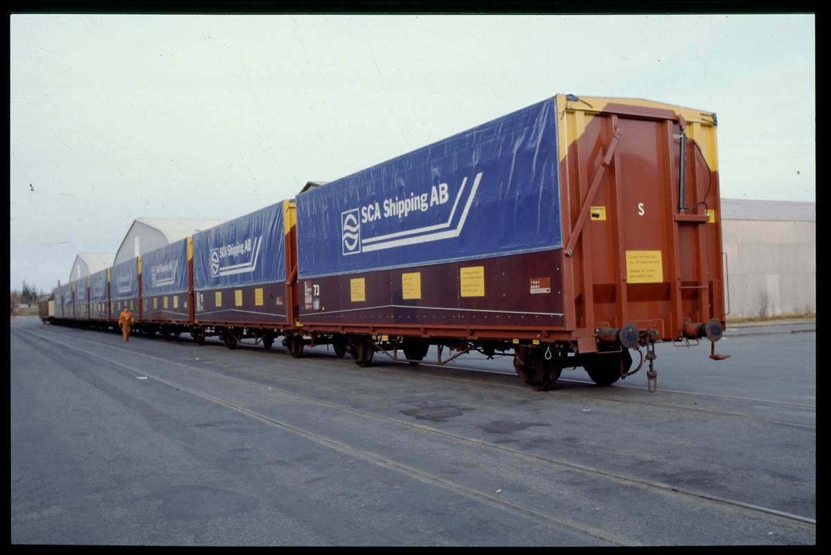 Statens Järnvägar, SJ godsvagn med öppningsbar sida märkta SCA Shipping AB.