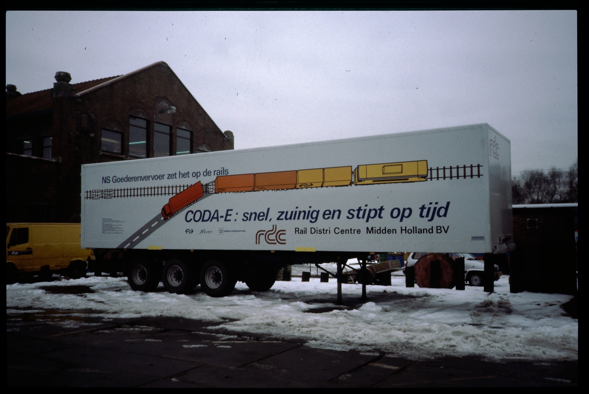 Lastbilssläp med text på holländska: NS Goederenvervoer zet het op de rails.