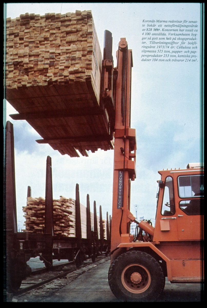 Lastning av virke på godsvagn med gaffeltruck.