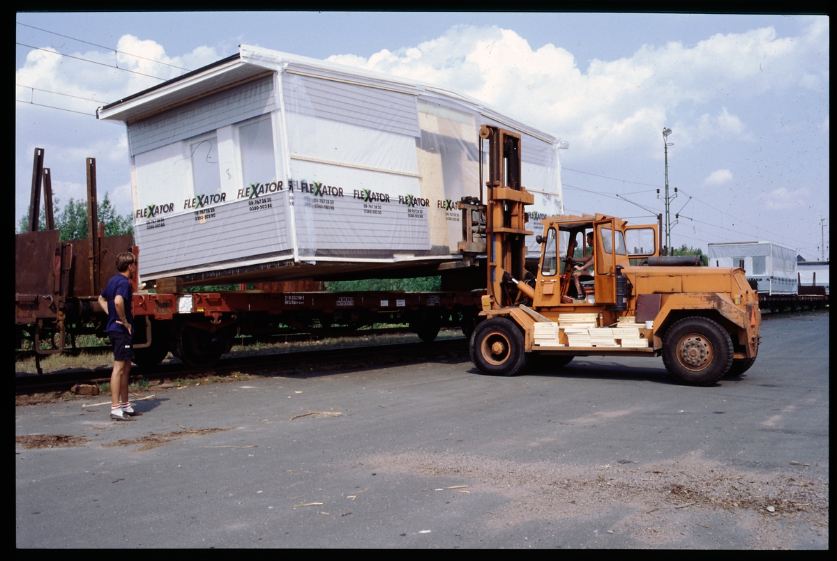 Lastning/lossning av husmodul med Ljungbytruck. Statens Järnvägar, SJ Kbps 21-74-335 2 494-9.