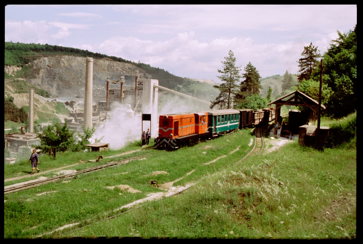 Diesellok med personvagn vid kalkverk utanför Hunedoara.