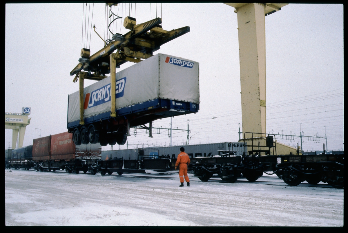 Statens Järnvägar, SJ Sds. Lastning/lossning av lastbilssläp.