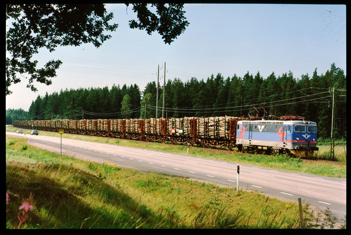 Virkestransport med Västgötapendeln. Statens Järnvägar, SJ Rc3 1058.