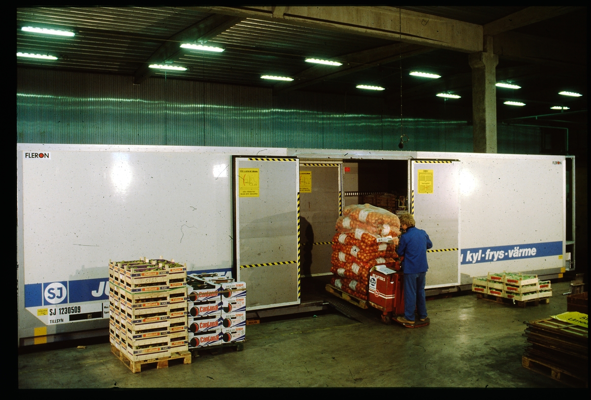 Lastning av SJ jumbocontainer 1230509, med pallyftare.