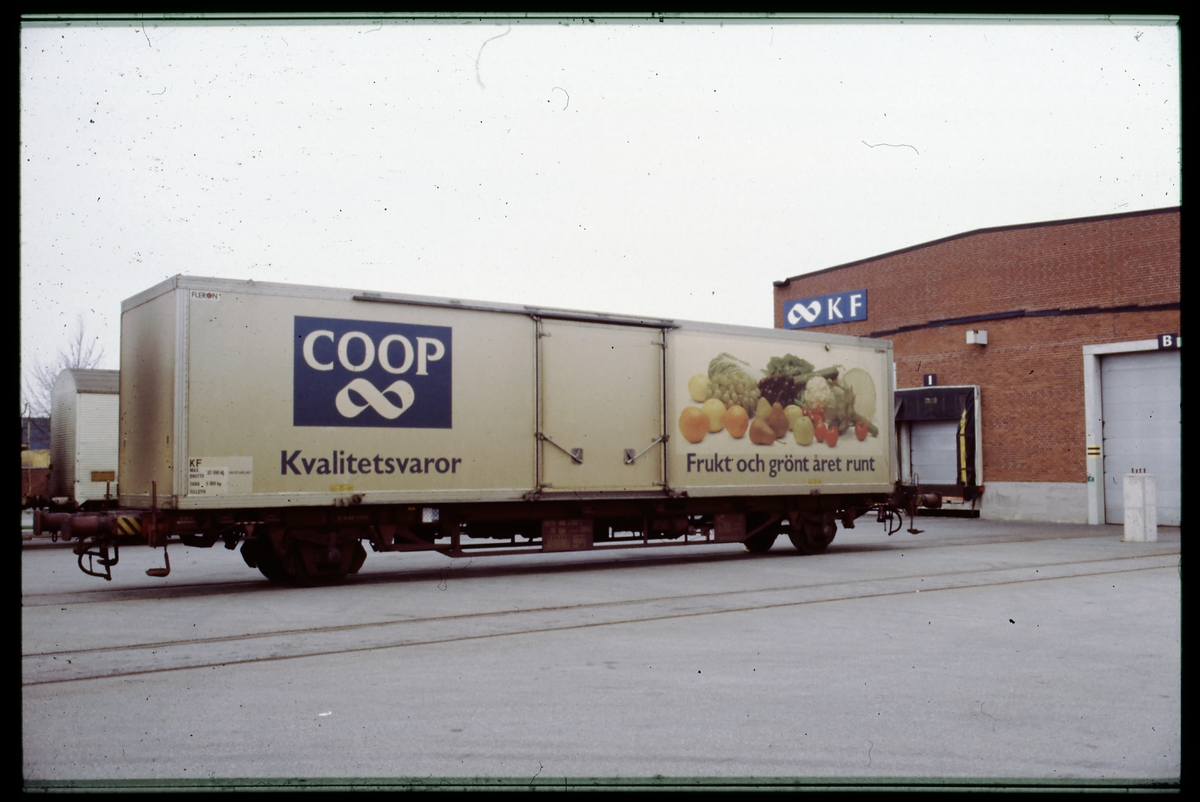 Coop-container lastad på SJ Lgjs-vagn. Statens Järnvägar.