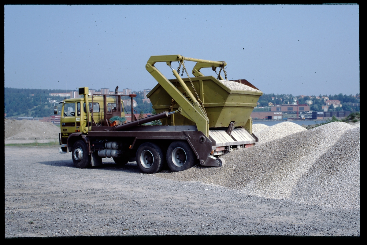 Lastbil med gruscontainer, strax innan lossning av grus.
