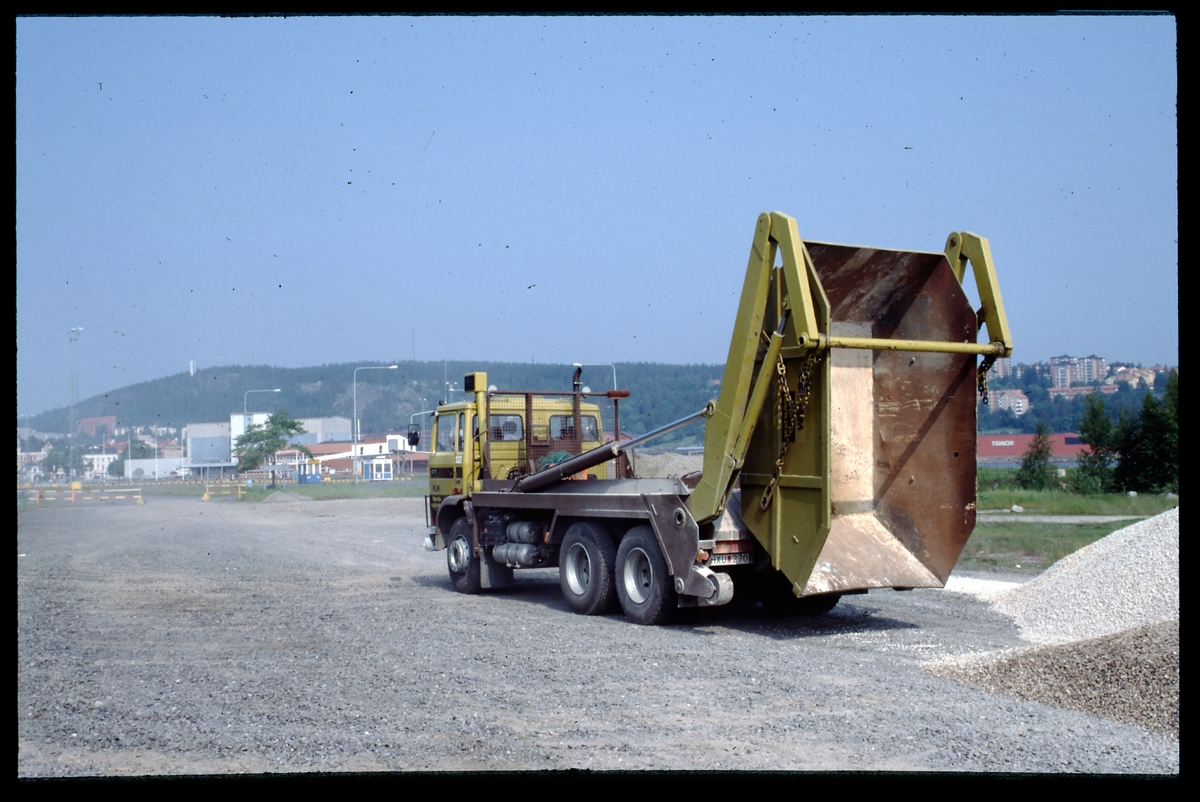 Lastbil med gruscontainer, strax efter lossning av grus.