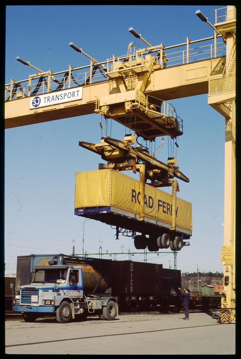 Lossning/lastning av släp. Svelast lastbil Scania 112m.