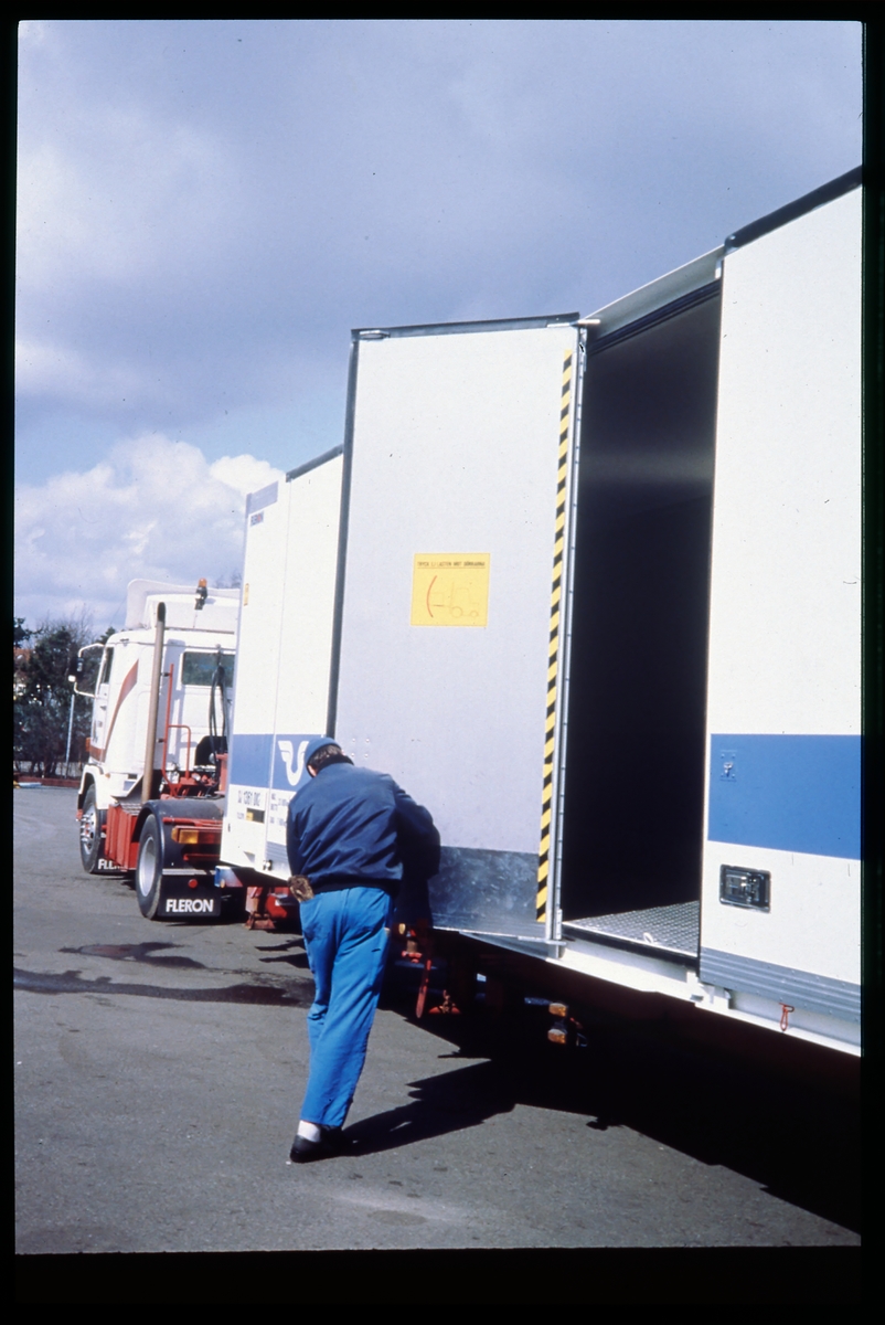 Statens Järnvägar, SJ jumbocontainer, lastad på lastbilssläp.