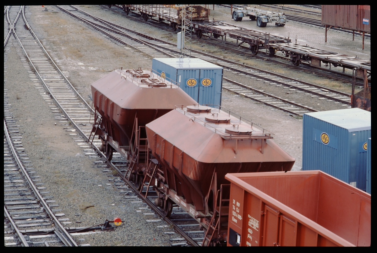 Godsvagnar på bangård, däribland SJ Eaos 31-74-533 4 000-0. Statens Järnvägar.