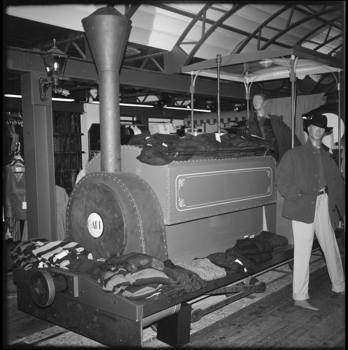 Titel: Troligen Trafikaktiebolaget Grängesberg – Oxelösunds Järnvägar, TGOJ ångloksmodell i Scania-Vabis klädbutik.