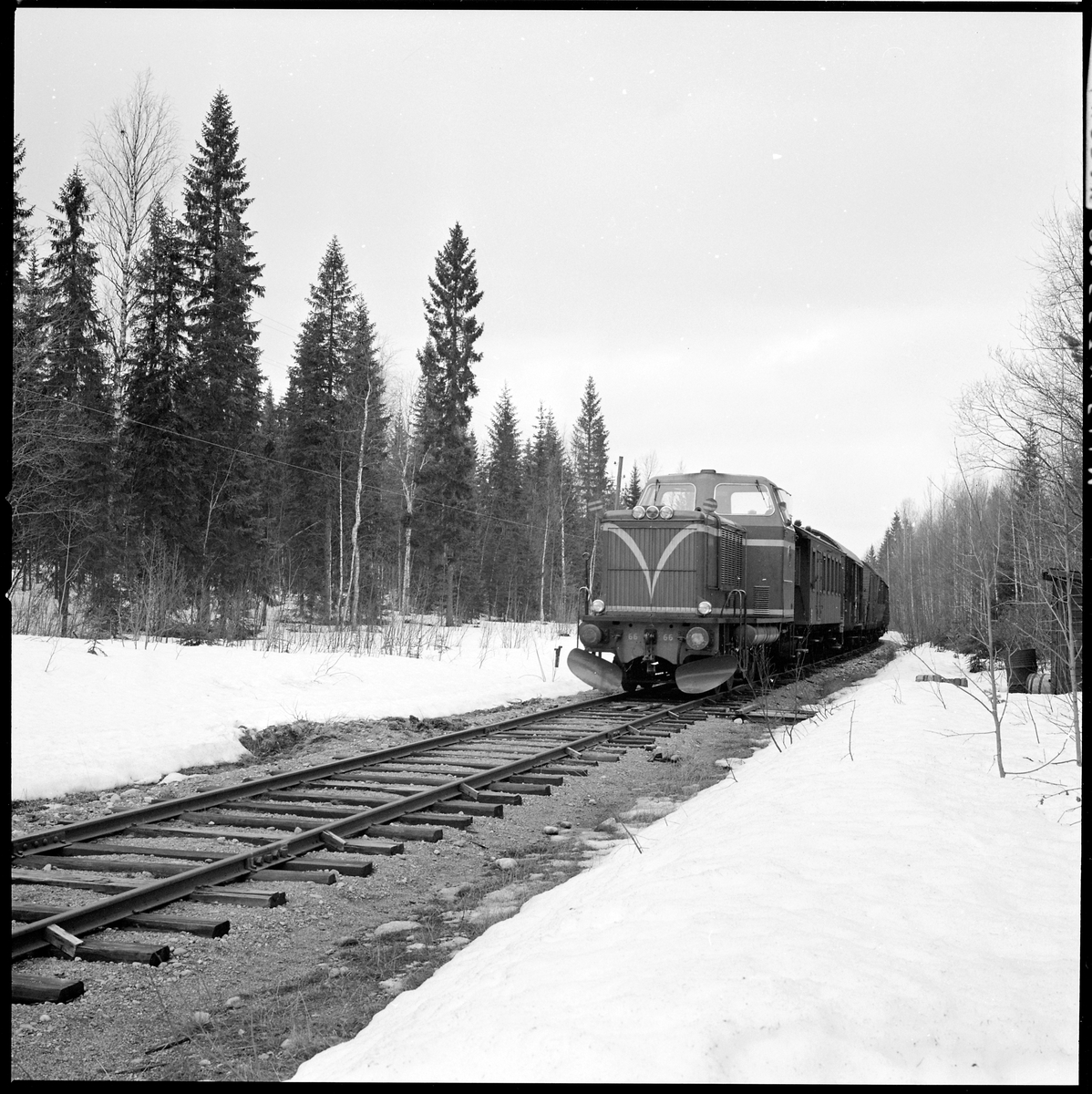 Tåg vid Lessjömyren på väg mot Forsmo, draget av SJ T2 66. Statens Järnvägar.