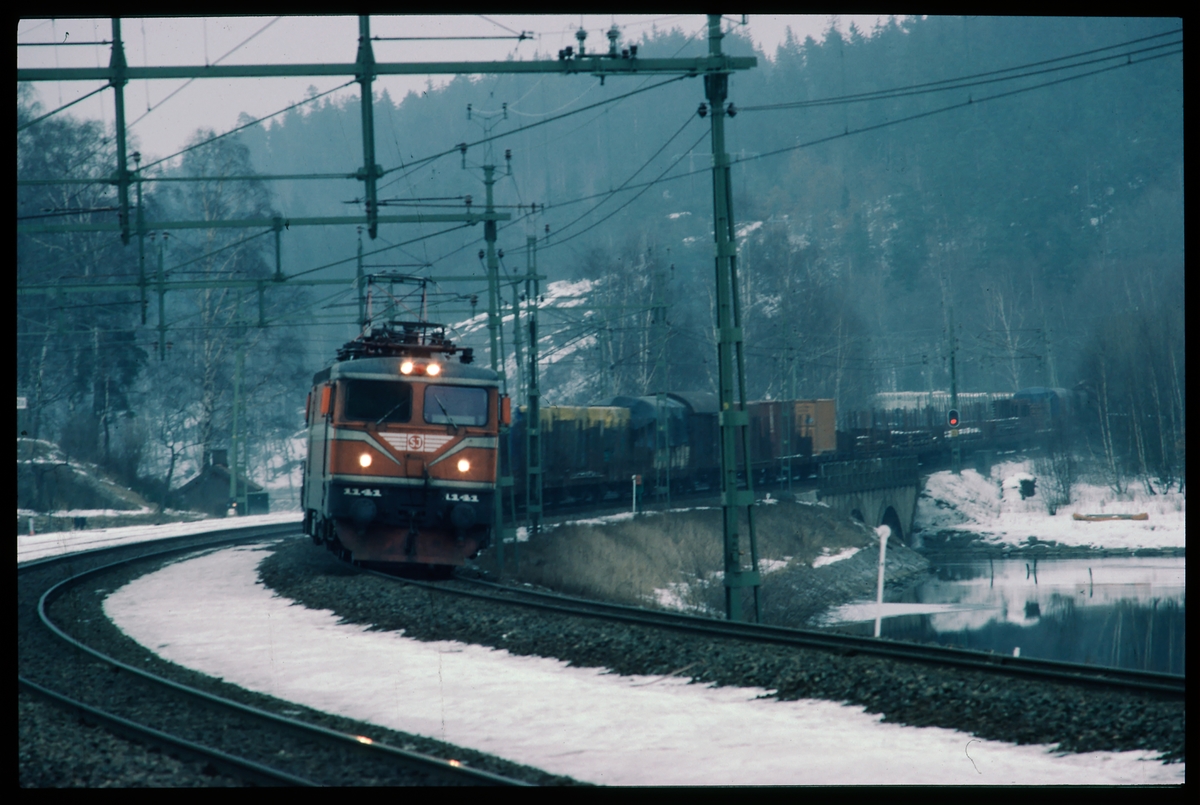 Ellok med godsvagnar. Statens Järnvägar, SJ Rc 1141, tillverkat 1975 av ASEA.