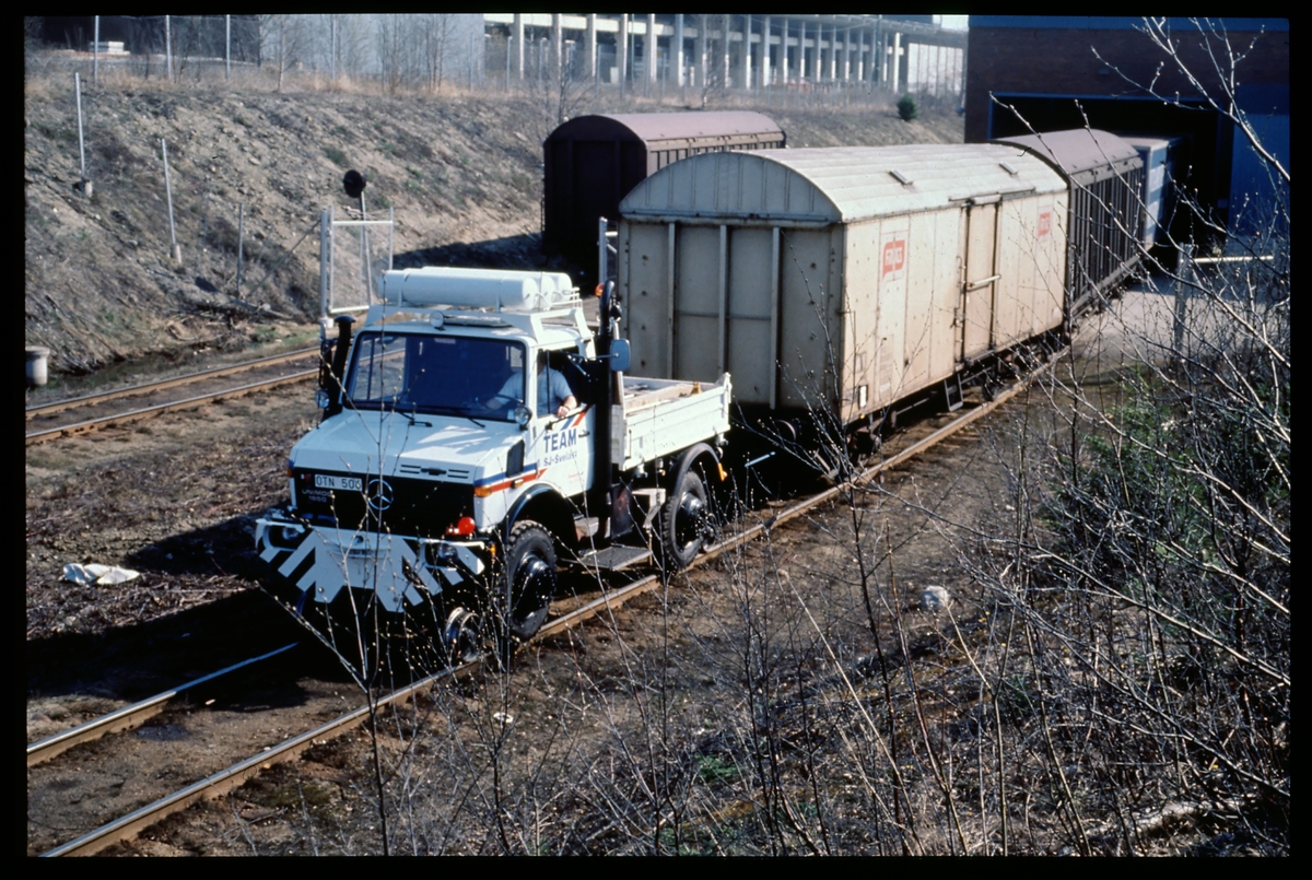 Kombinerad väg och rälsgående lastbil med godsvagnar. Statens Järnvägar, SJ-Svelast.