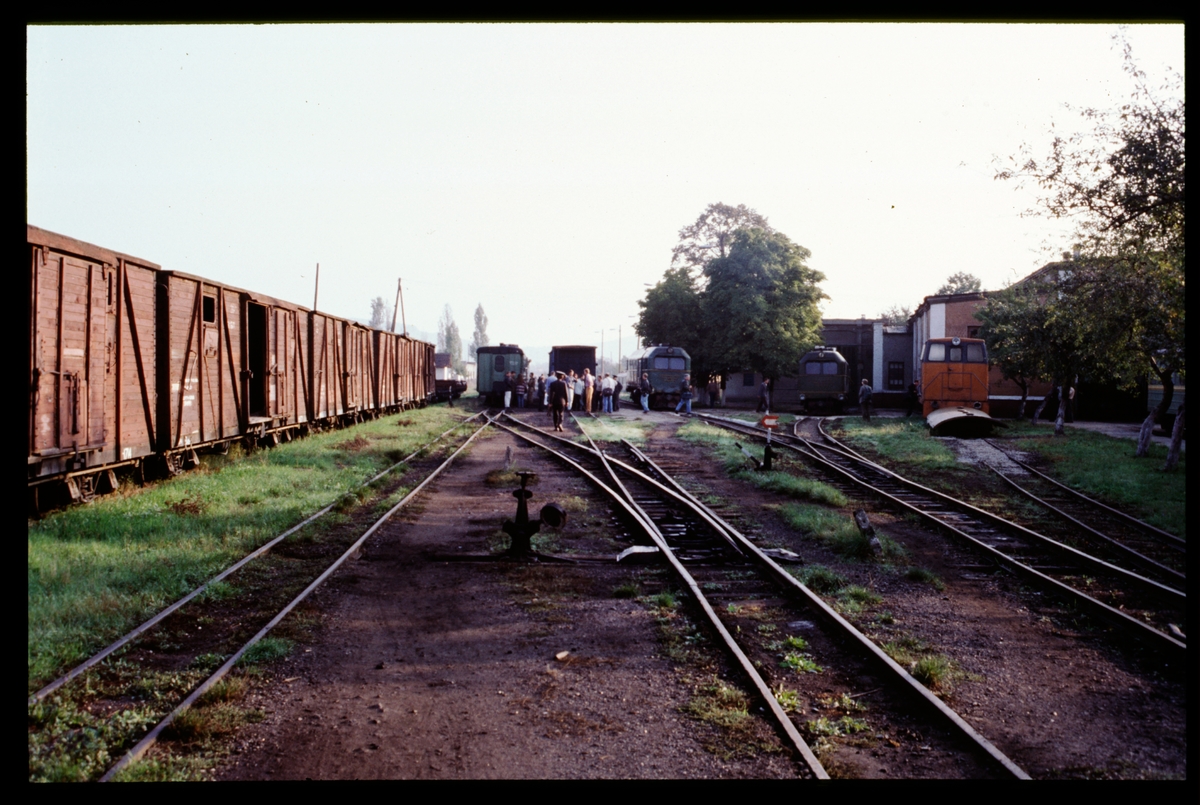 Smalspårsbangård med godståg, Lokomotor och folk.