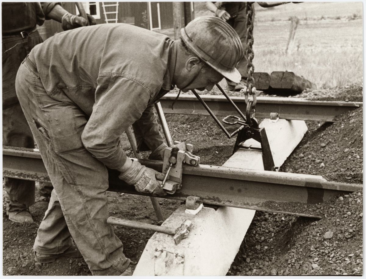 Rune Dahlman använder hävarm för fästning av länk av räl på betongsliper.