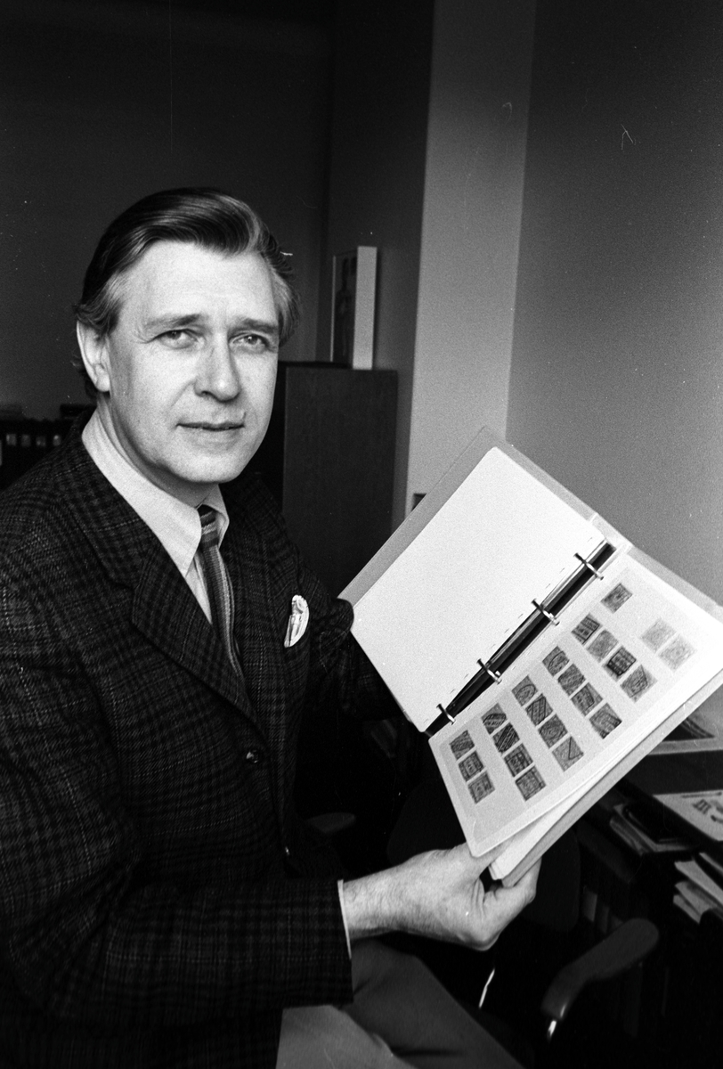 Avdelningsdirektör, Ad, Åke Torkelstam, Aap, med frimärksalbum. Reportage för SJ-nytt.