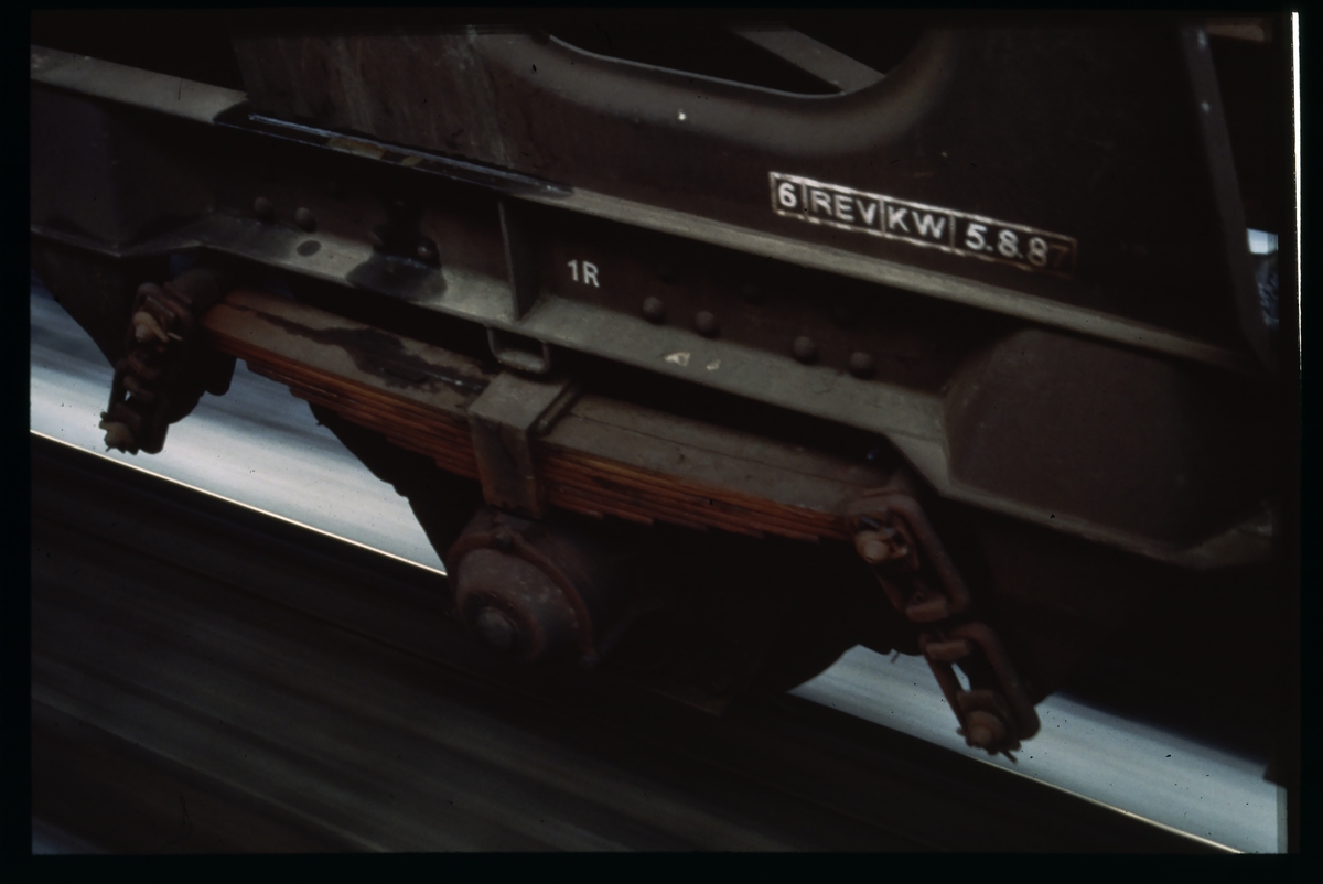 Detalj av hjulupphängning på tvåaxlig vagn.