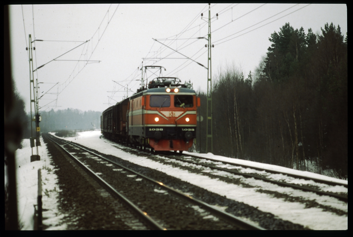 Statens Järnvägar SJ Rc2 1034 med godsvagnar.