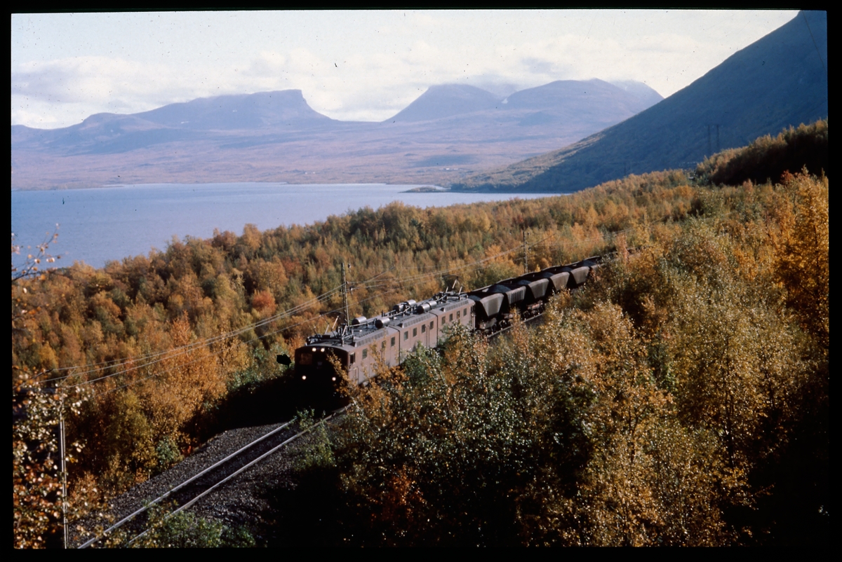 Malmtåg passerar Torneträsk. Lapporten i fonden.