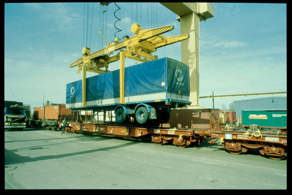 Lastning av lastbilssläp på en SJ Sdms. Vagn.