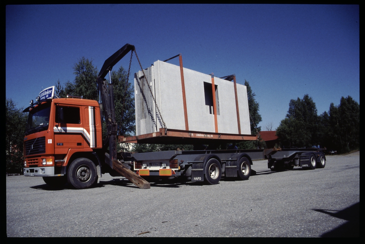Överflyttning av last från containervagn till lastbil.
