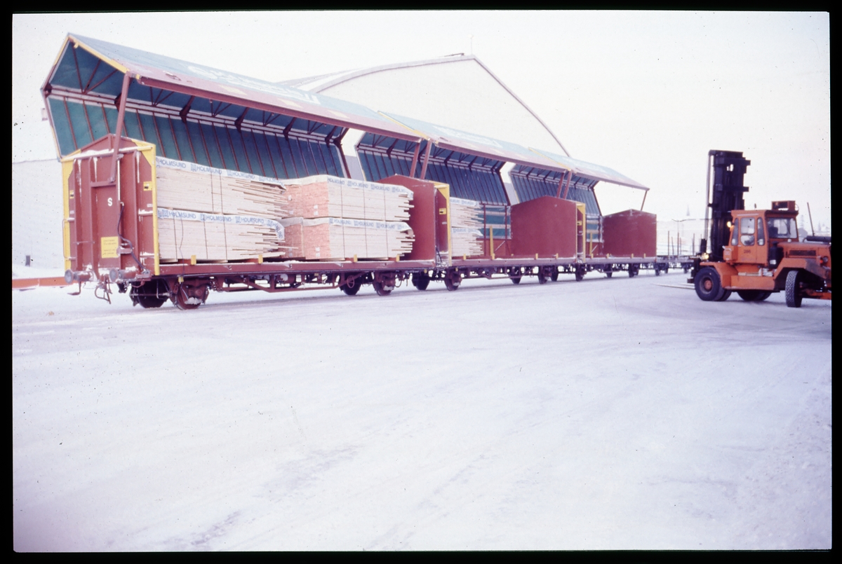 Specialvagn för virkespaket med öppningsbar sida, Statens Järnvägar, SJ Hbins-u typ 853.