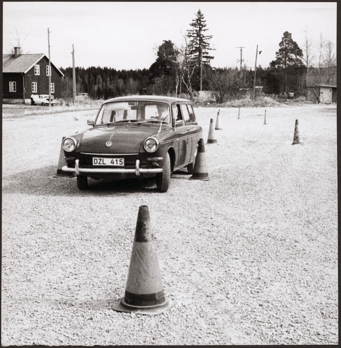 Sigvard Ljungs manövreringsförmåga med sin bil testas i en konad bana under ett bilrally anordnat av Trafikaktiebolaget Grängesberg - Oxelösunds Järnvägar, TGOJ.
