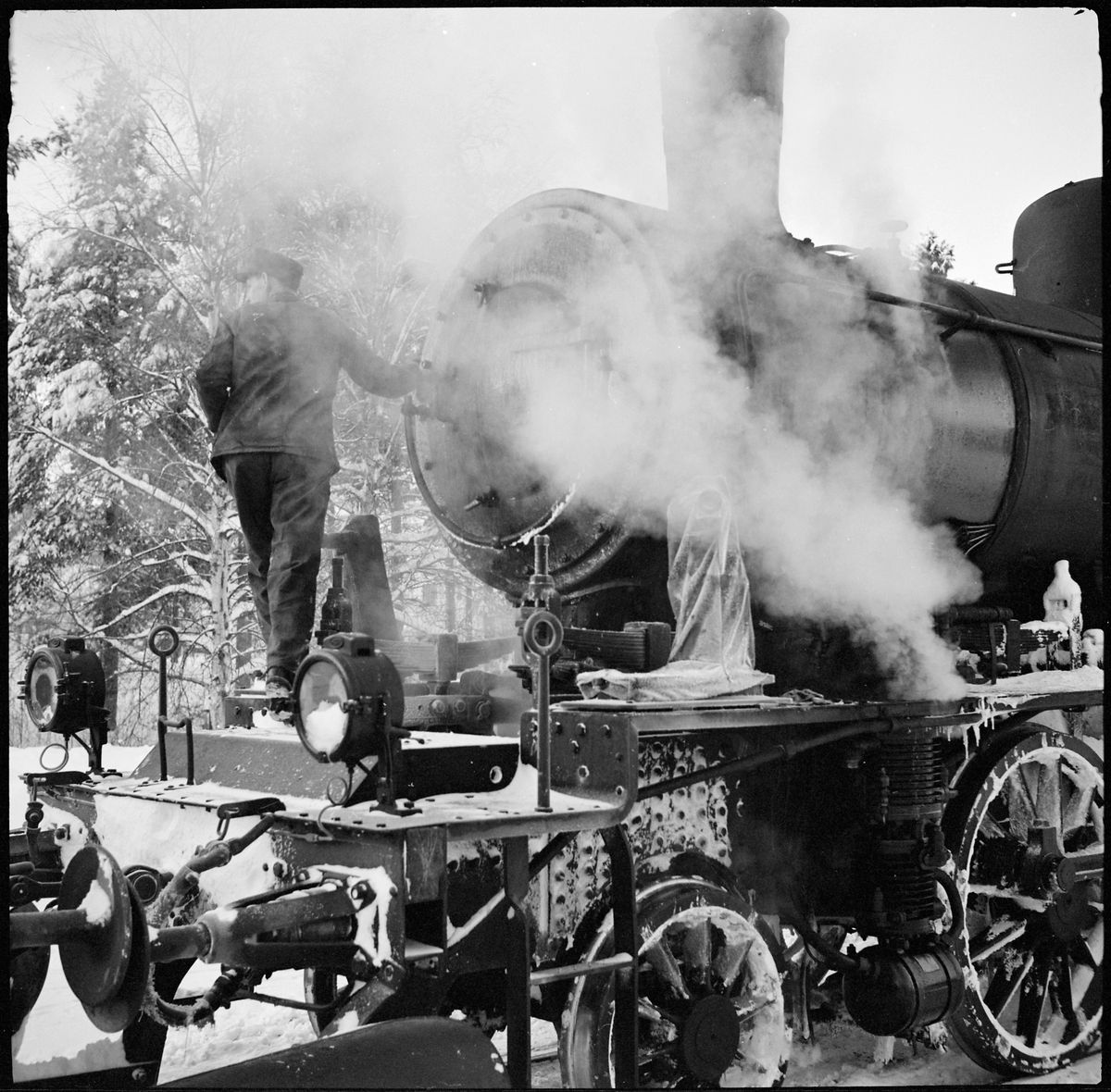 Titel: Knut Blomqvist smörjer K-K pumpen under snöröjning på Hotingbanan.