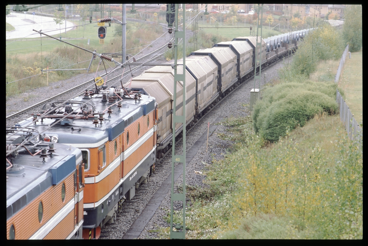 Statens Järnvägar, SJ Rc. med Sj Shimmns. Och öppna vagnar lastade med stålrullar.